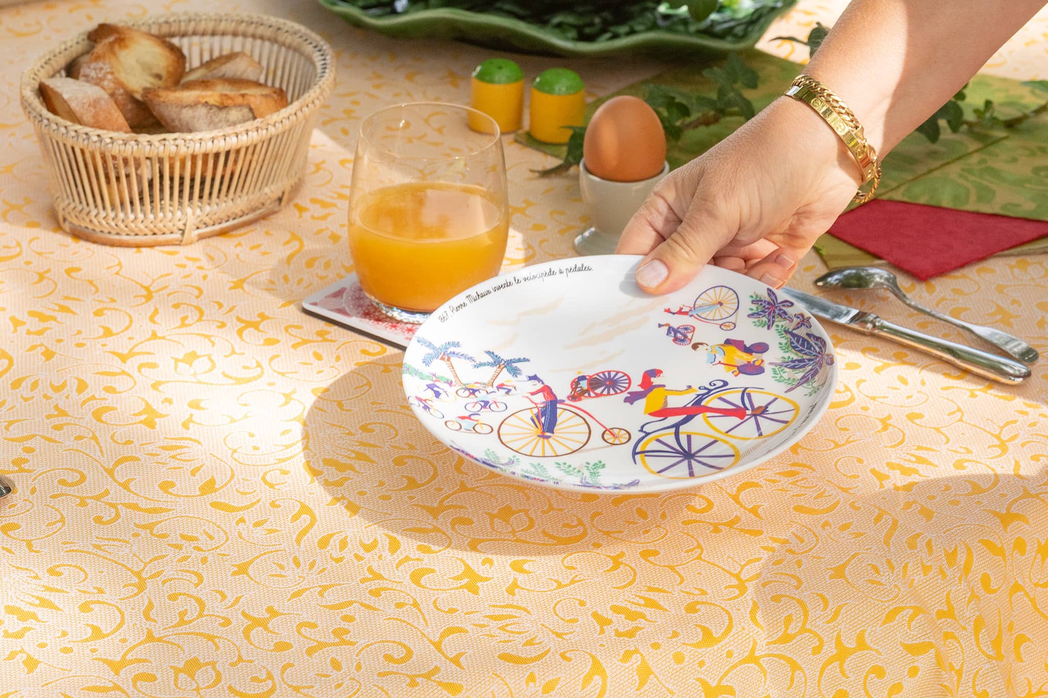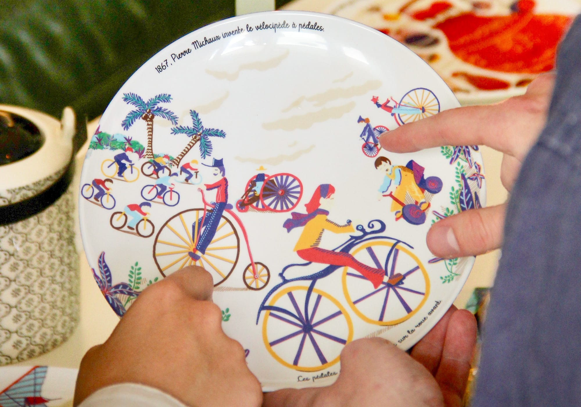 Un texte descriptif accompagne l'illustration de l'assiette en mélamine, afin de toujours garder en mémoire que c'est en 1861 que le français Pierre Michaux invente le vélocipède à pédales.